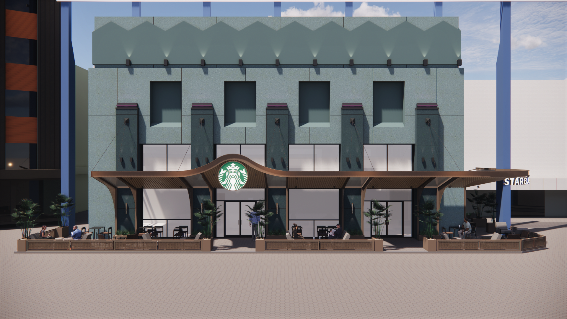 As one of two new Starbucks cafes planned for a future Universal Studios theme park, this 1400 SF grab n’ go location creates a fully immersive experience within a relatively small footprint. Inspiration is taken from the Park’s celestial theme and its turn-of-the-century aesthetic. The 360 degree mural celebrates the Starbucks origin story, rooted in nautical exploration, and navigation by a sea of stars. The central Siren figure on the rear wall guides customers along their journey, culminating in a gilded dome over the hand-off plane. The influence of nautical instrument design can be seen throughout the bar and merchandise metalwork